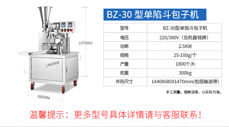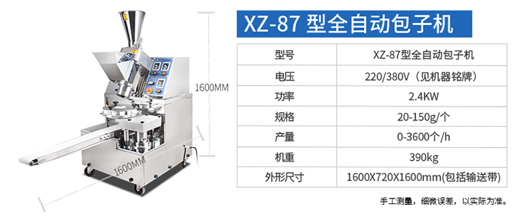 XZ-86型全自動包子機,可生產各種肉包、菜包、肉菜包、小籠包、湯包、水晶包、圓饅頭、奶黃包、豆沙包、叉燒包、南瓜餅、煎堆等十幾種包餡制品。適用于賓館、飯店、學校、機關企業(yè)食堂、饅頭或包子加工廠、早餐工程店及速凍食品廠等單位??蓾M足不同客戶群體。免費提供工藝技術。免費上門培訓指導安裝。