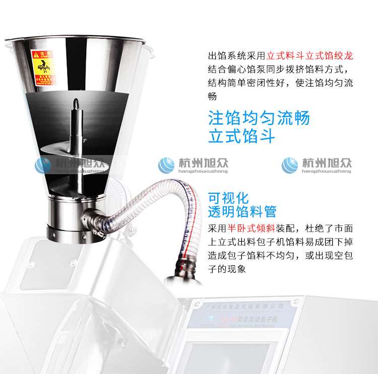 ◆出餡系統(tǒng):立式料斗,立式餡攪龍結合偏心餡泵同步撥擠餡料方式。結構簡單密閉性好。使注餡 均勻流暢,實用于決大多數(shù) 菜包,肉包,灌湯包,奶黃包,豆沙蓮蓉包 等餡料。并且餡管采用半臥式傾斜裝配,防止了市面上立式出料包子機餡料容易成團下掉造成包子餡料不均勻或出現(xiàn)空包子的現(xiàn)象。