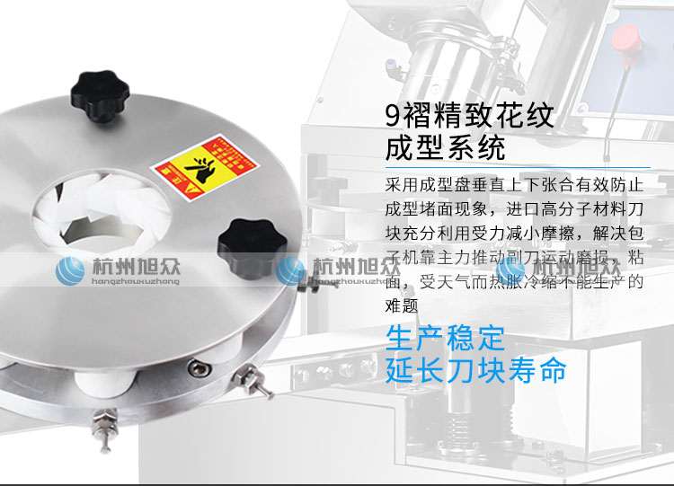 ◆包子成型系統(tǒng) :采用成型盤垂直上下移動,配合刀塊張合徹底防止以前包子機做大包子成型堵面的現(xiàn)象。9塊進口高分子材料刀塊充分利用力學原理均衡受力減小摩擦,徹底解決了其它包子機成型刀塊靠一塊主刀推動其它8塊副刀運動易磨損,刀夾面粘面,易受天氣變化而熱脹冷縮不能正常生產的的難題。生產穩(wěn)定大大延長成型刀塊使用時間。