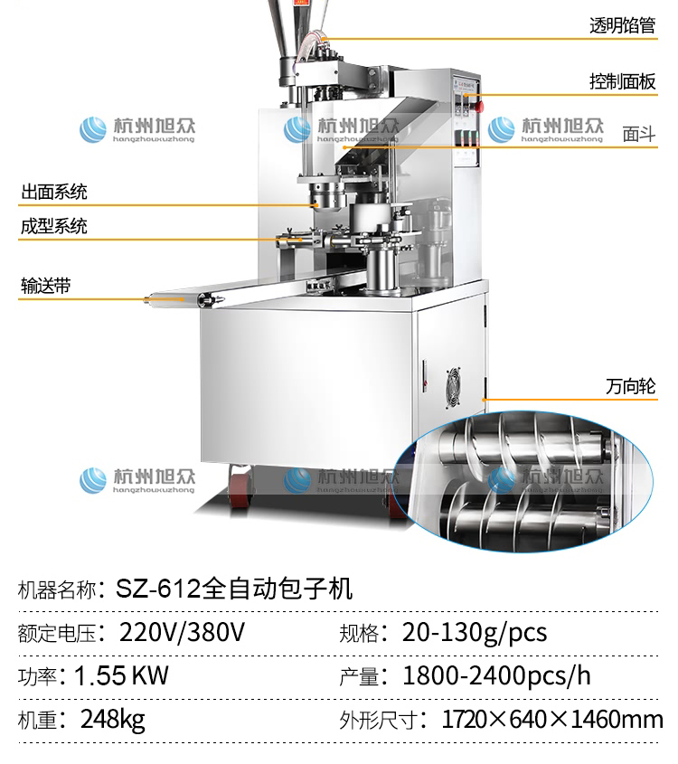 SZ-612全自動包子機(jī),22800元(不含運(yùn)費(fèi)不含稅價格),SZ-612型全自動包子機(jī)是一款設(shè)計(jì)先進(jìn),結(jié)構(gòu)簡單,操作方便,生產(chǎn)性能穩(wěn)定的設(shè)備。其體積小重量輕,外殼主要部件采用不銹鋼制作,外觀精美。