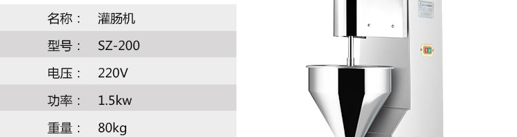 SZ-200灌腸機,適合灌制各種香腸、紅腸、臘腸及糊狀制品。本機使用敞開式不銹鋼料斗,適用于連續(xù)添加物料;與灌裝手接觸部件全部采用優(yōu)質(zhì)不銹鋼制作以防生銹;該機自動貨程度高,技術(shù)先進(jìn)、性能穩(wěn)定、操作簡便、工作效率高,具有不破壞物料成份,保質(zhì)、保鮮等特點。