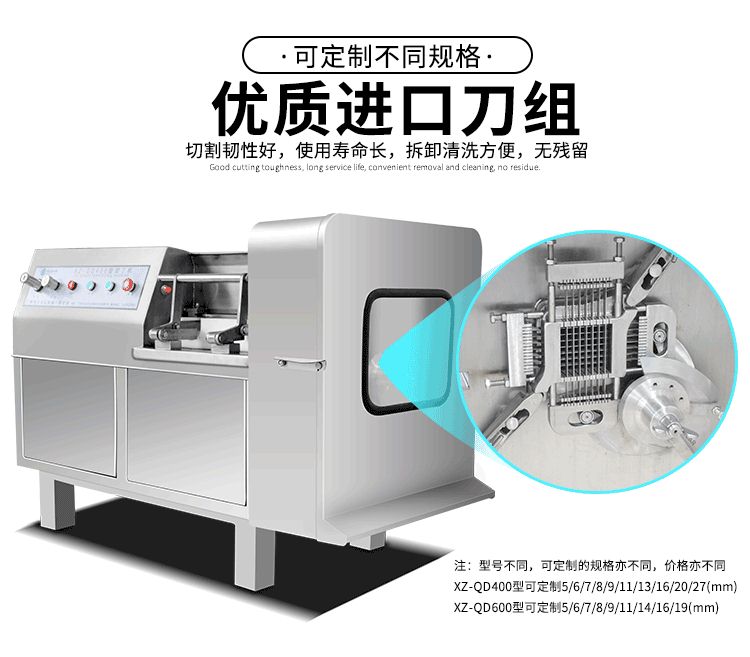 將肉塊、脂肪等主要原料,切割成用戶所需的肉丁,調(diào)整刀柵的尺寸可切出肉絲、肉片、肉丁。尺寸的大小,由刀柵中刀片數(shù)量來決定。
