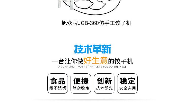 JGB系列餃子自動成型機(jī),均適用于賓館、飯店、餐廳、團(tuán)體食堂加工、幼兒園、速凍餃子生產(chǎn)等。