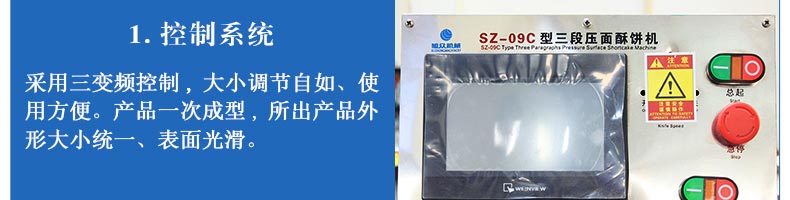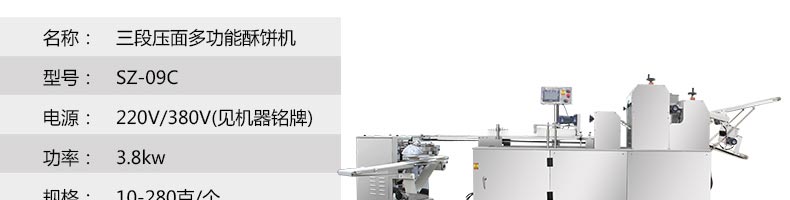 SZ-09C三段壓面酥餅機,生產(chǎn)速度、制品大小、重量、皮餡比例可隨時調整、變更。適用于蘇式月餅、綠豆餅、老婆餅、蔥油餅、鮮花餅、肉松餅、金華酥餅等。適用于大、中型糕餅生產(chǎn)廠家,免費提供工藝技術。