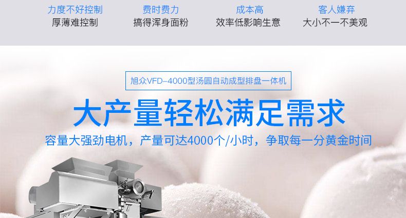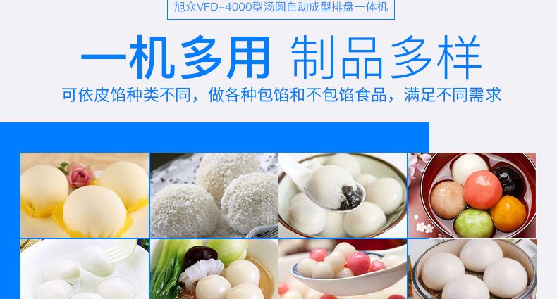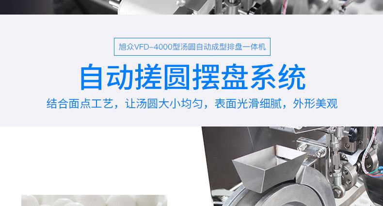 旭眾牌VFD-4000型湯圓自動(dòng)成型排盤一體機(jī)是一款功能齊全、適用性廣的機(jī)器,可依外皮及餡料的各類不同,制作湯圓、豆沙包、南瓜餅、奶黃包、含餡饅頭、玉兔包等包餡食品。